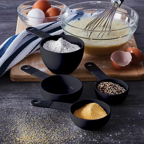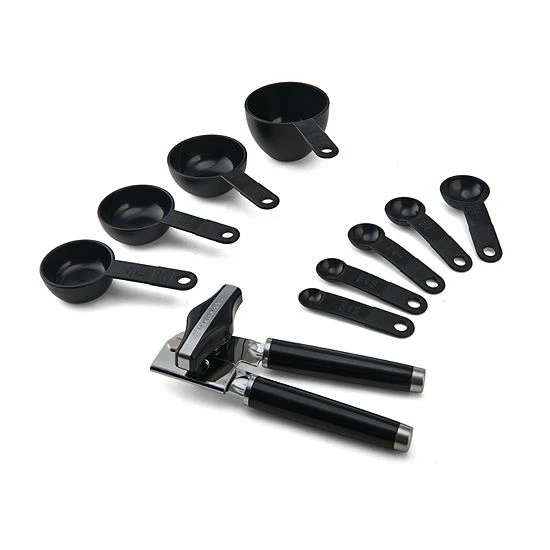 - Includes: slotted turner, basting spoon, scraper spatula, euro peeler, utility whisk, can opener, set of 4 measuring cups, and set 5 measuring spoons