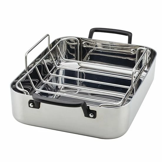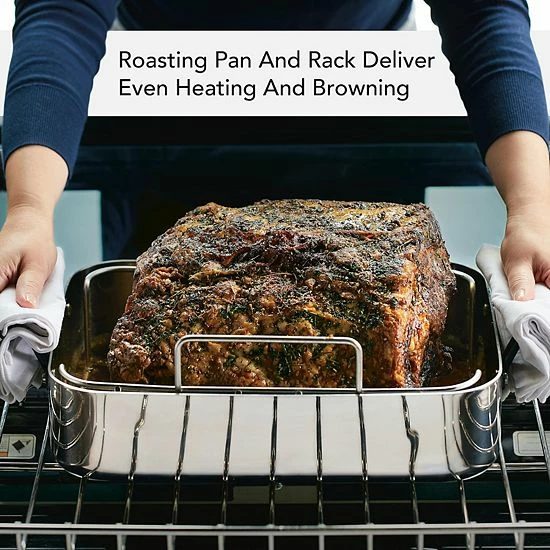- Durable roaster is crafted from five layers of heat conductive metal and the stainless steel rack elevates foods for better airflow, greater heat distribution, and exquisite oven roasting