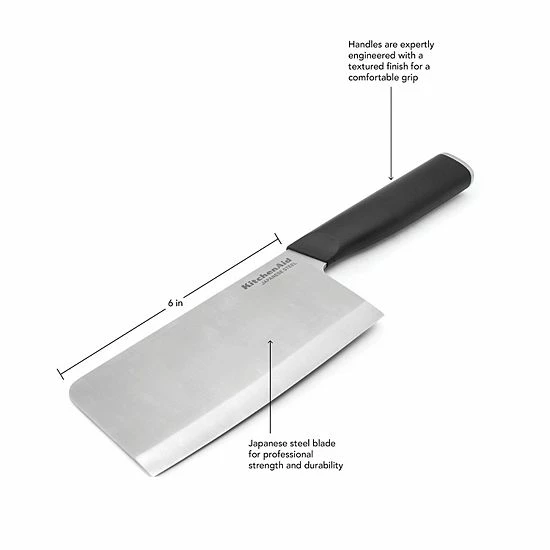 The perfect tool for prepping thick cuts of meat and poultry, this KitchenAid 6-Inch Cleaver features a high-carbon imported Japanese steel blade hardened and tempered to provide a long lasting edge for a professional, quality cut every time.
