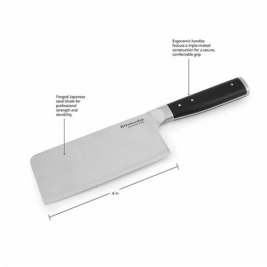 The perfect tool for prepping thick cuts of meat and poultry, this KitchenAid 6-Inch Cleaver features a high-carbon imported Japanese steel blade hardened and tempered to provide a long lasting edge for a professional, quality cut every time.