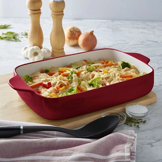 This KitchenAid Rectangular Baker is a kitchen essential for making casseroles for family meals. Made from highly durable stoneware, the vitrified construction offers chip and stain resistance. Expect professional results when using this nonporous bakeware, which provides even heat distribution and retention.